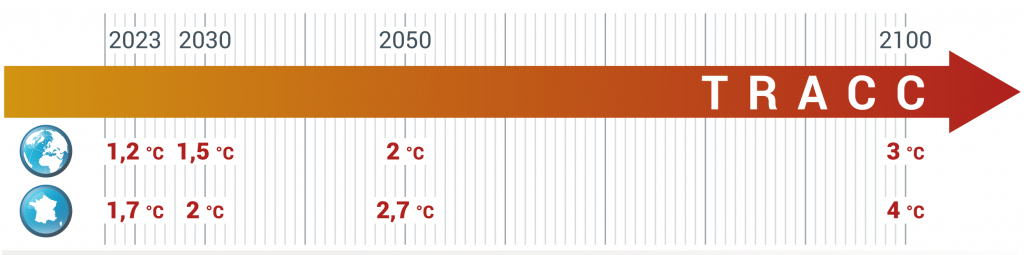 Pour la France hexagonale, qui se réchauffe plus vite que la moyenne mondiale, le scénario prenant en compte les engagements existants implique une hausse des températures moyennes de 2 °C en 2030, 2,7 °C en 2050 et 4 °C en 2100 2. Ce scénario de réchauffement climatique, après une consultation publique, est devenue la Trajectoire de Référence pour l’Adaptation de la France au Changement Climatique (TRACC). Elle définit à quel niveau de réchauffement futur il nous faut nous adapter.