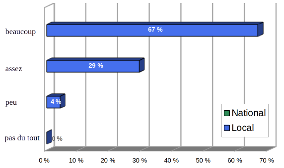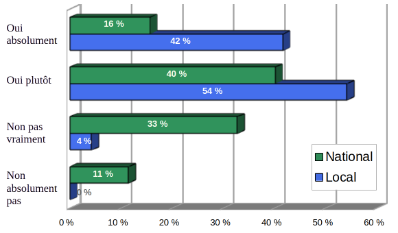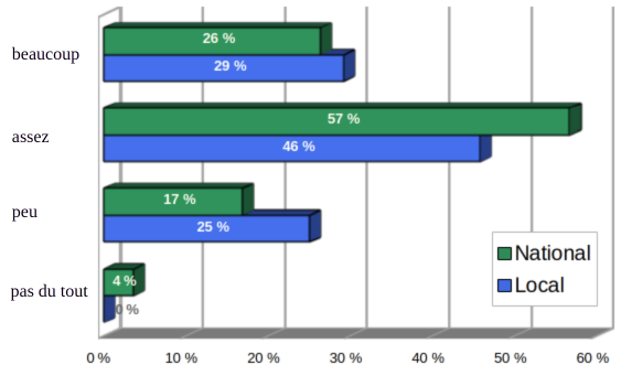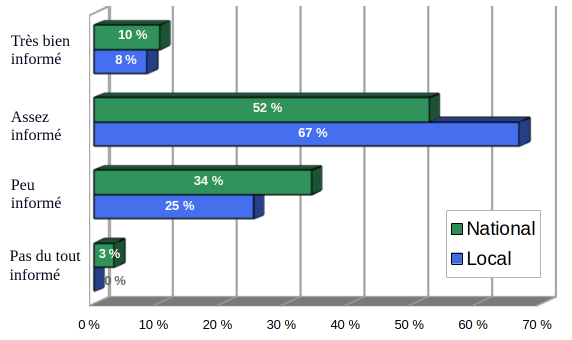 Toutefois, une proportion encore significative de personnes sentent peu ou pas informés (25 % au niveau local, 37 % au niveau national), ce qui indique que les efforts d’information sont à poursuivre.