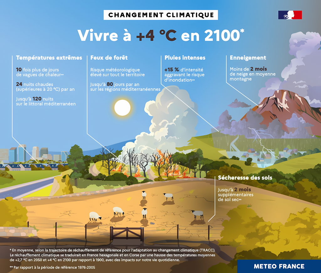 Météo France a évalué les conséquences du réchauffement climatique tel que défini par la Trajectoire de Référence, soit +4° à horizon 2100.