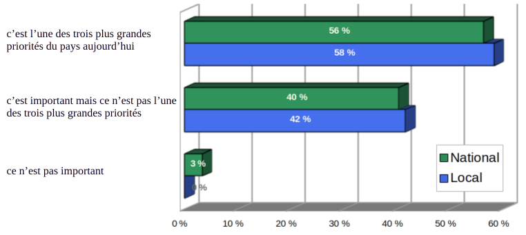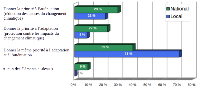 Sur cette question, on voit un alignement presque parfait entre les réponses au niveau local et au niveau national 4. La majorité des répondants pensent que l’adaptation est vraiment une priorité. Quant à ceux qui estiment que ce n’est pas important, ils sont très peu nombreux (3 % au niveau national).
