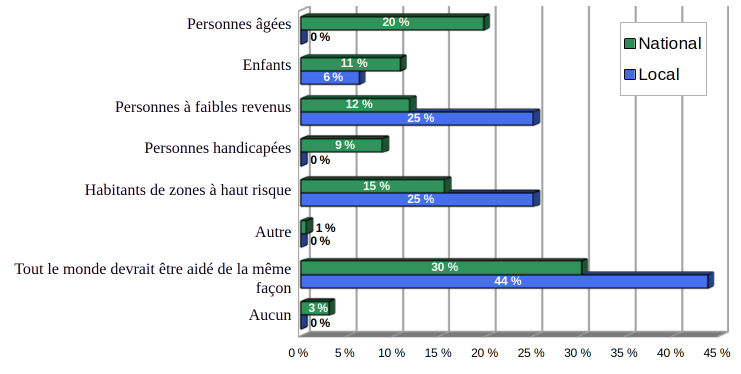 Au niveau national, si la première réponse est aussi que tout le monde devrait être aidé de la même façon, mais à un niveau plus faible (30%), la catégorie citée de suite derrière est celle des personnes âgées (20%). Les autres catégories sont moins citées, avec dans l’ordre les habitants de zones à risque (15%), les personnes à faibles revenus (12%), les enfants (11%) et les personnes handicapées (9%).