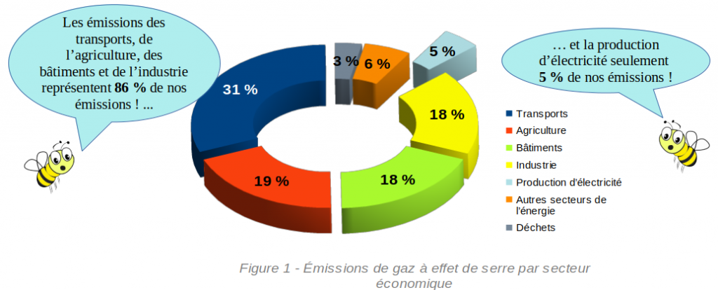 Ayons aussi à l’esprit que l’électricité contribue pour 25 % à nos besoins énergétiques [3], et donc pour seulement 5 % de nos émissions.