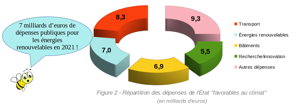 Les dépenses sur les énergies renouvelables (7 milliards d’euros, soit 19 % des 37 milliards) est donc à peu près égal à celui pour les bâtiments (6,9 milliards), et à peine inférieur à celui sur les transports (8,3 milliards).