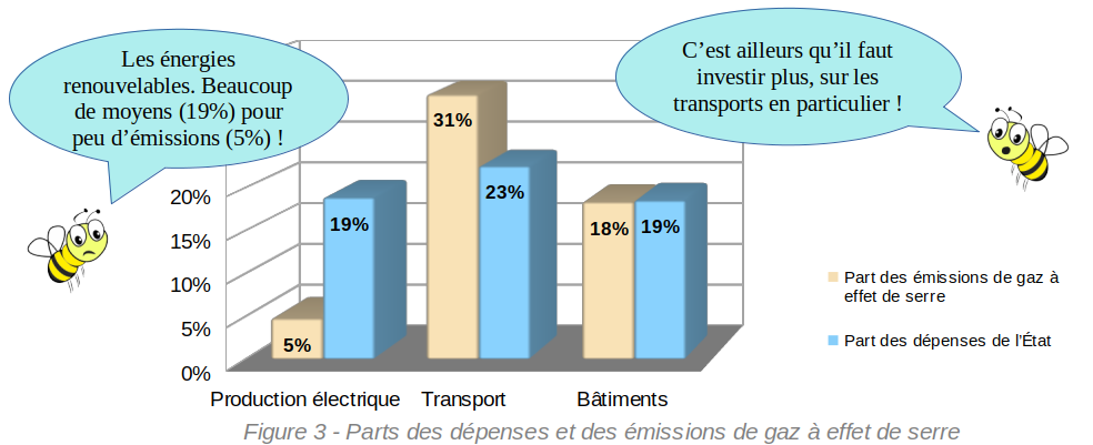 On voit que les dépenses concernant la production électrique (les énergies renouvelables) sont largement surdimensionnées par rapport à leur impact sur le climat. Pour être efficace, il faudrait investir plus massivement sur les logements (isolation, modes de chauffage) et les transports.