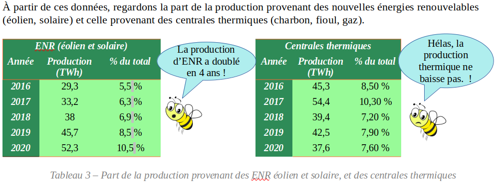 À partir de ces données, regardons la part de la production provenant des nouvelles énergies renouvelables (éolien, solaire) et celle provenant des centrales thermiques (charbon, fioul, gaz).