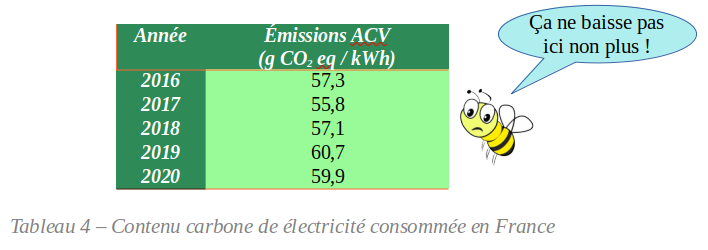 Là encore, il n’y a pas de baisse du contenu carbone de l’électricité, malgré la part croissante d’éolien et de solaire. Cela confirme bien l’absence d’effet positif des nouvelles énergies renouvelables sur la production électrique en France.