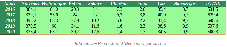 Voici maintenant l’électricité produite (en TWh) pour les différents moyens par an [6].