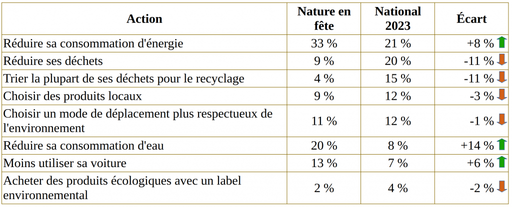 - Les déchets (réduction et tri) sont beaucoup moins cités localement, ce qui peut indiquer soit une perception d’efficacité plus faible, soit plus probablement une intégration déjà acquise dans les pratiques (et donc jugée non prioritaire).